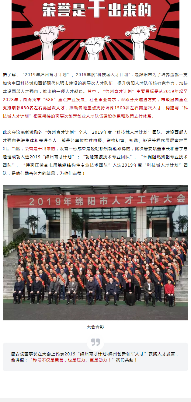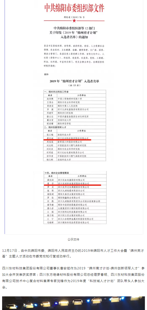 12月10日,綿陽市市委組織部等12部門聯(lián)合發(fā)布《關(guān)于印發(fā)2019年“綿州育才計劃”入選者名單的通知》(綿組通〔2019〕78號),公示了14類125名入選者名單,公司董事長唐安斌成功入選2019“綿州育才計劃·綿州創(chuàng)新領(lǐng)軍人才”, 總經(jīng)理曹學(xué)成功入選2019年“綿州育才計劃·綿州企業(yè)管理菁英”。